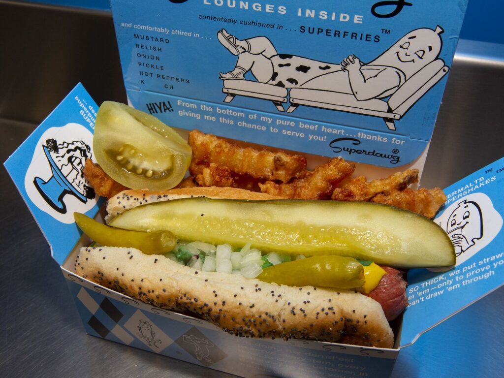 Superdawg Drive-In is a Chicago landmark, known for its retro atmosphere and its unique hot dog recipe. Their hot dogs are served on a poppy seed bun with a generous helping of toppings, including a signature pickled green tomato.